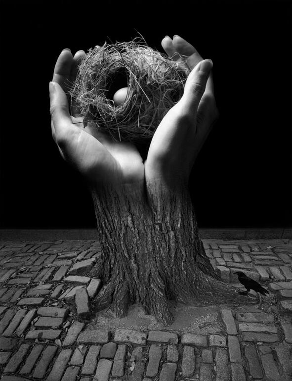 Here, the photographer has created a high contrast, black & white image of a tree trunk blending into human hands that are holding a small birds nest with an egg inside. Looking at the photo, I noticed this almost makes the hands act as the branches and leaves of the tree. I think the symbolism of this could be to show how people and nature can be interlinked.