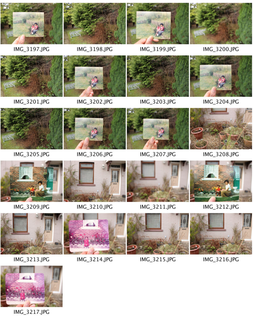 The shutter speed for these photos was between 1/125 sec and 1/160 sec to prevent them from being blurry due to my hands shaking as I was taking the pictures and holding up the photos of my mum and grandmother (both at the same time each with one hand). A problem that I ran into during this shoot was achieving a deep depth of field. I wanted everything both far away (the scene in the frame) and close to the camera (the printed picture) to be in focus but could not use a large f-number as it would make the images too dark. I also did not want to increase the ISO to anything over 400 to avoid noise and my pictures being too grainy. To solve this problem, I took a photo first with the printed picture in full focus, before removing it to photograph only the background in full focus. I did this with the intention of making a composite image in photoshop, with only the focused photos edited together.