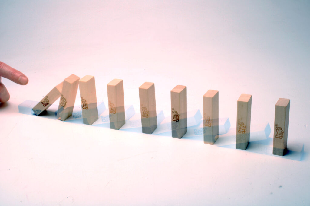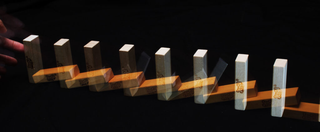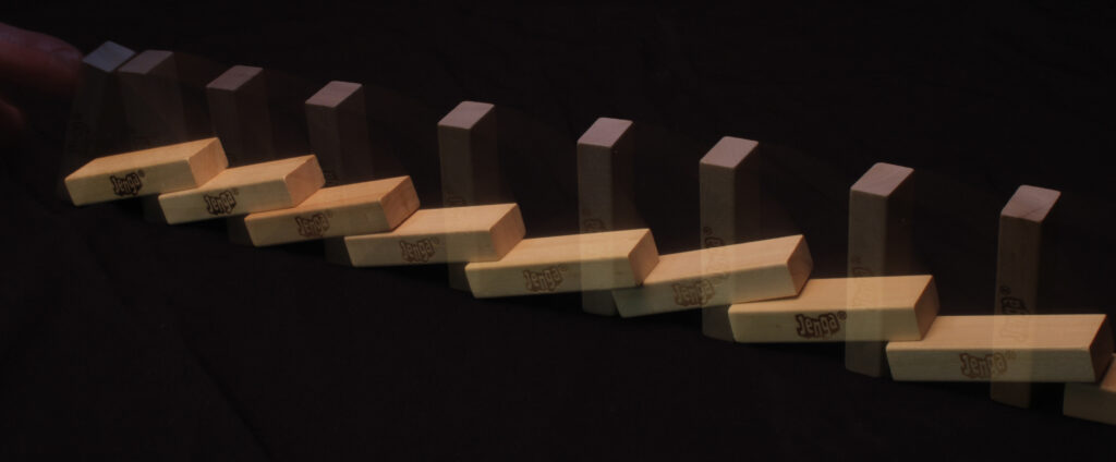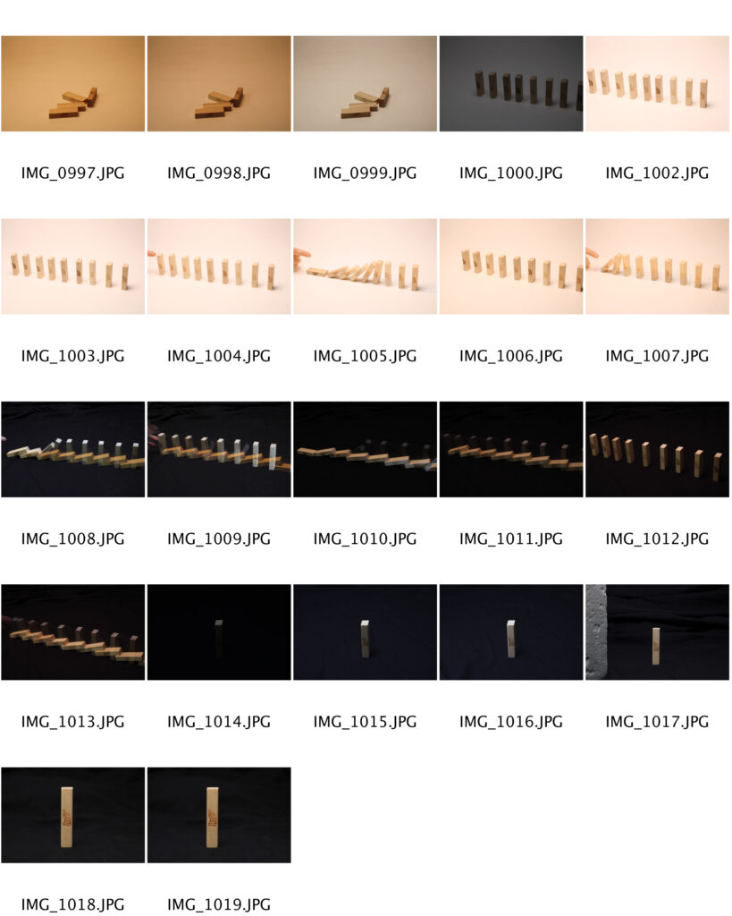 For my first attempt at sequence photography, I used Jenga blocks and dice. I wanted to capture the process of the blocks falling down in bursts but the flash in the studio wasn’t quick enough so I had to take pictures individually and reposition the blocks back up multiple times after they had already fallen. I used a tripod to keep the camera still and took photos at different times. This is so it would be easier to make it look like it had all happened in one take.
