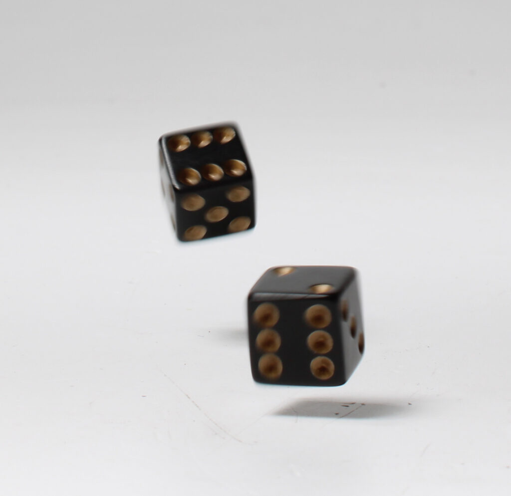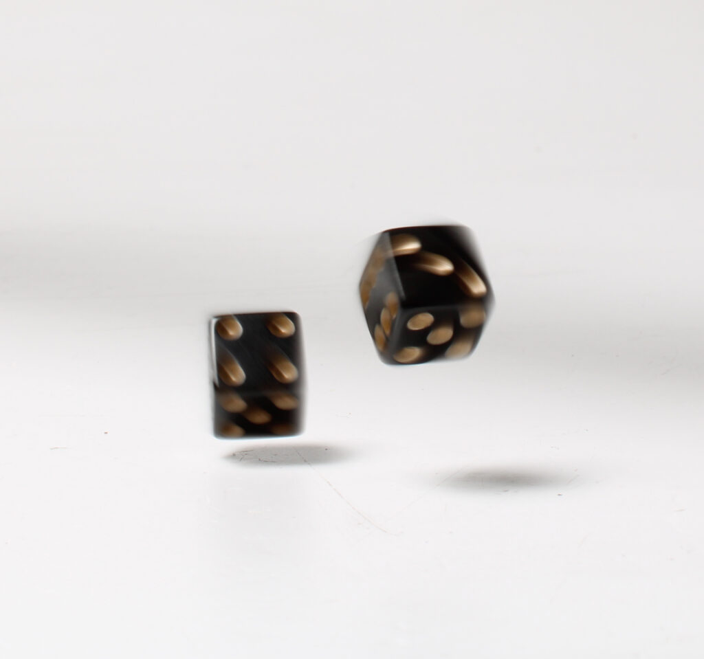 For the dice photos, I wanted to freeze the movement of both of them rolling in the air when someone threw them. I used black dice so they would show up easier against the white background.