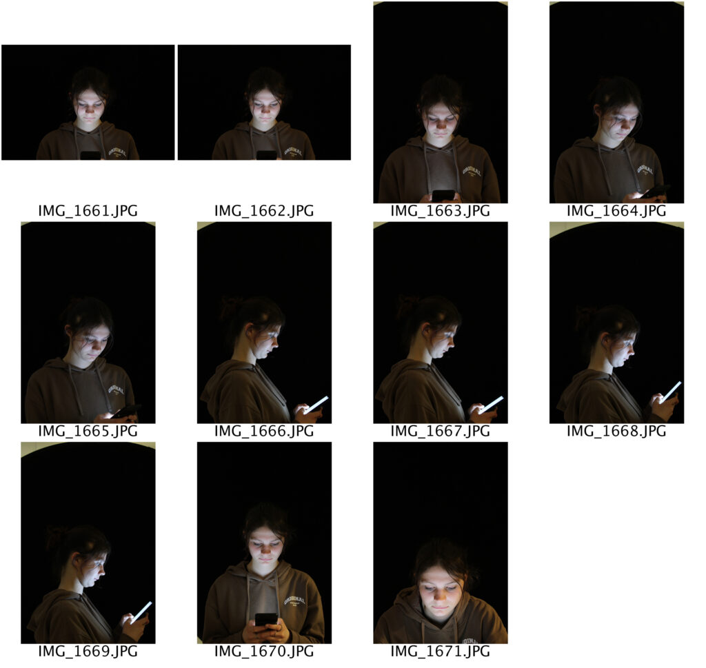 These are the photos I took in the studio. I made sure to use a young person as the model like I previously planned, and directed them to position themselves as if they were using their phone (making sure their screen brightness was at maximum). The reason why is chose to use a black background for this shoot was so that the light from the phone screen was the only thing illuminating the models face. I also figured the social media icons that I would be adding to the image would look better against a darker background.