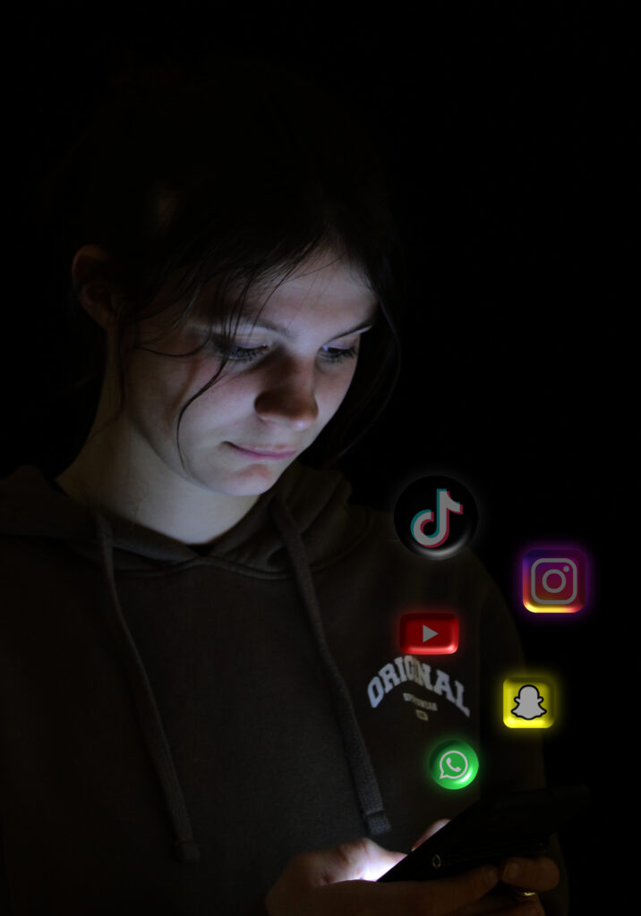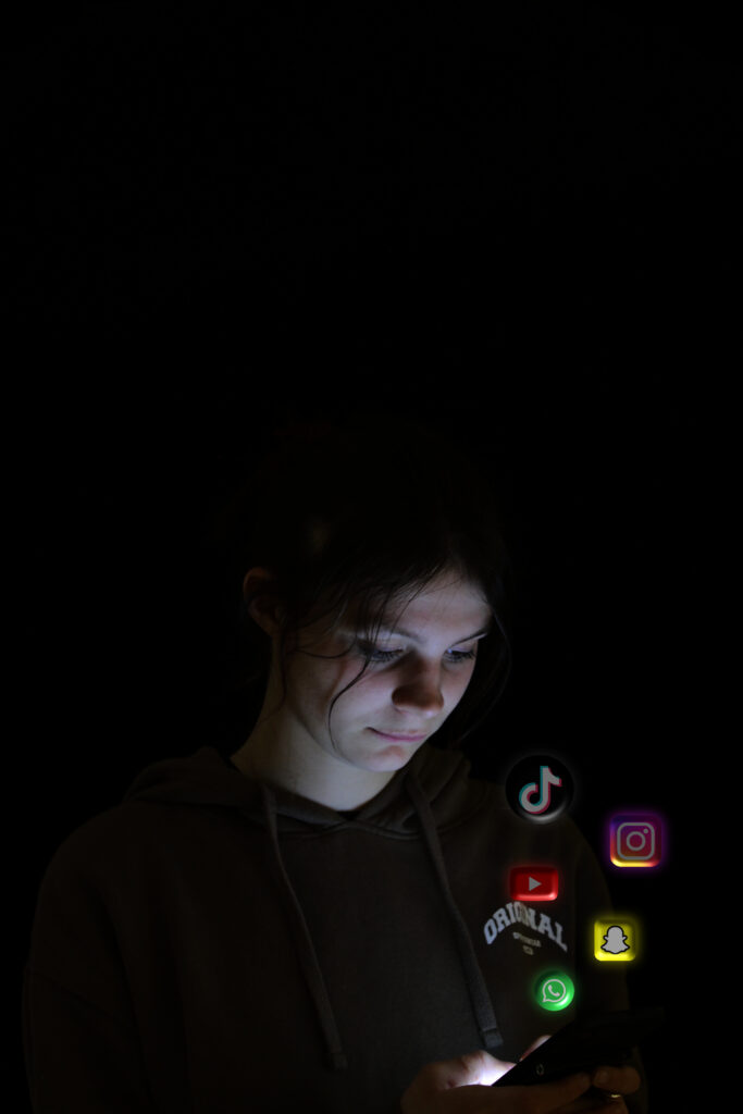 As a final outcome from this shoot, my aim is to produce a dimly lit picture of someone sat on the floor using their phone with a variety of social media logos surrounding them. My plan is to photograph someone young as I feel that the age of the model can reflect how such quickly evolving and demanding media trends can influence young minds and in turn, have a strong effect on the future of society as a whole.
