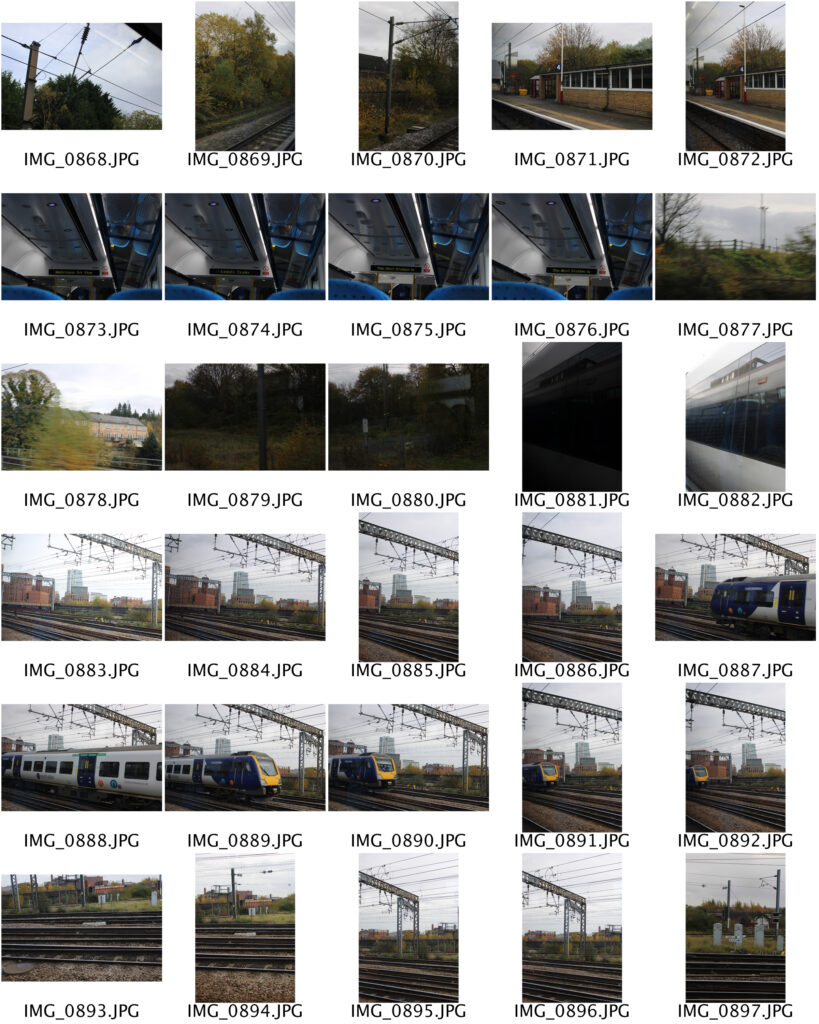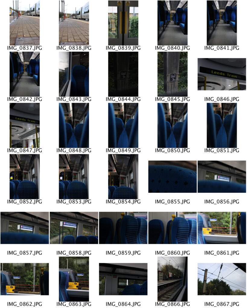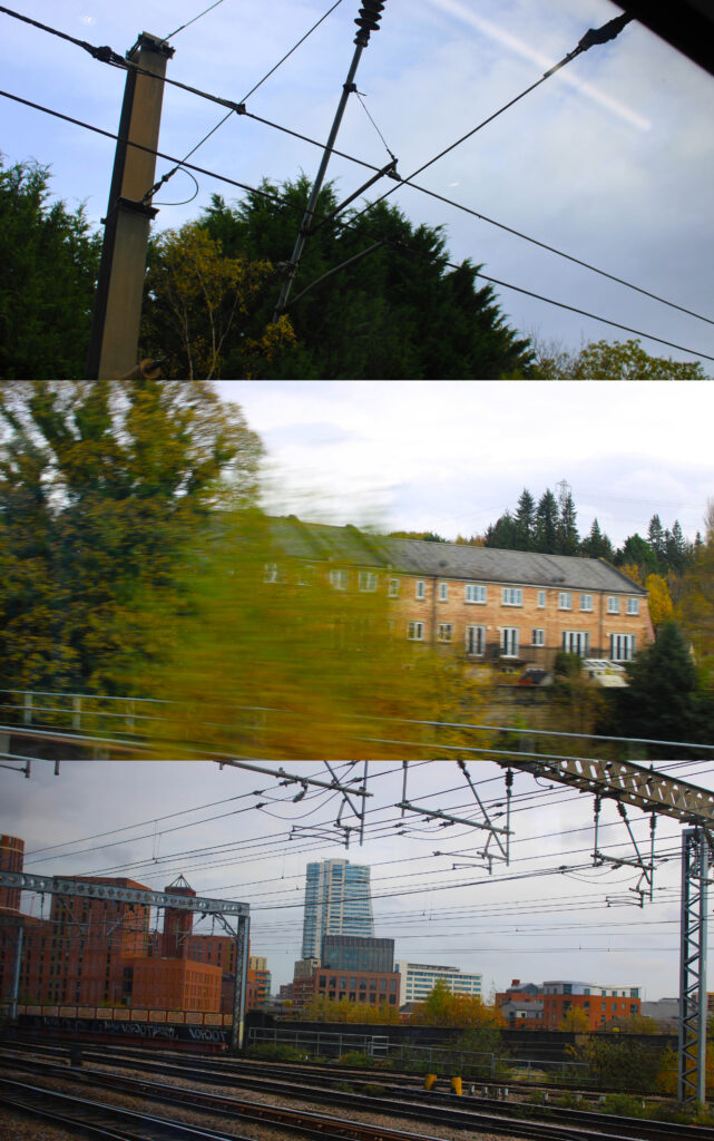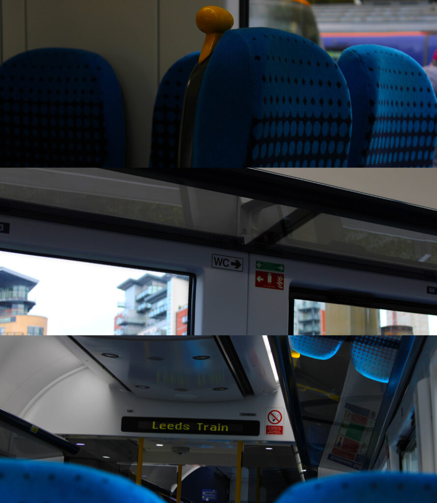 I traveled to Leeds on a train and took photos at Bradford Interchange, on the train and at Leeds Train Station. I took a lot of different photos as I want to present some of the best ones together by stacking them on top of each other. When doing this, I want to try and go from top to bottom, showing different points in the journey to show the passing of time as the photos at different locations were taken.