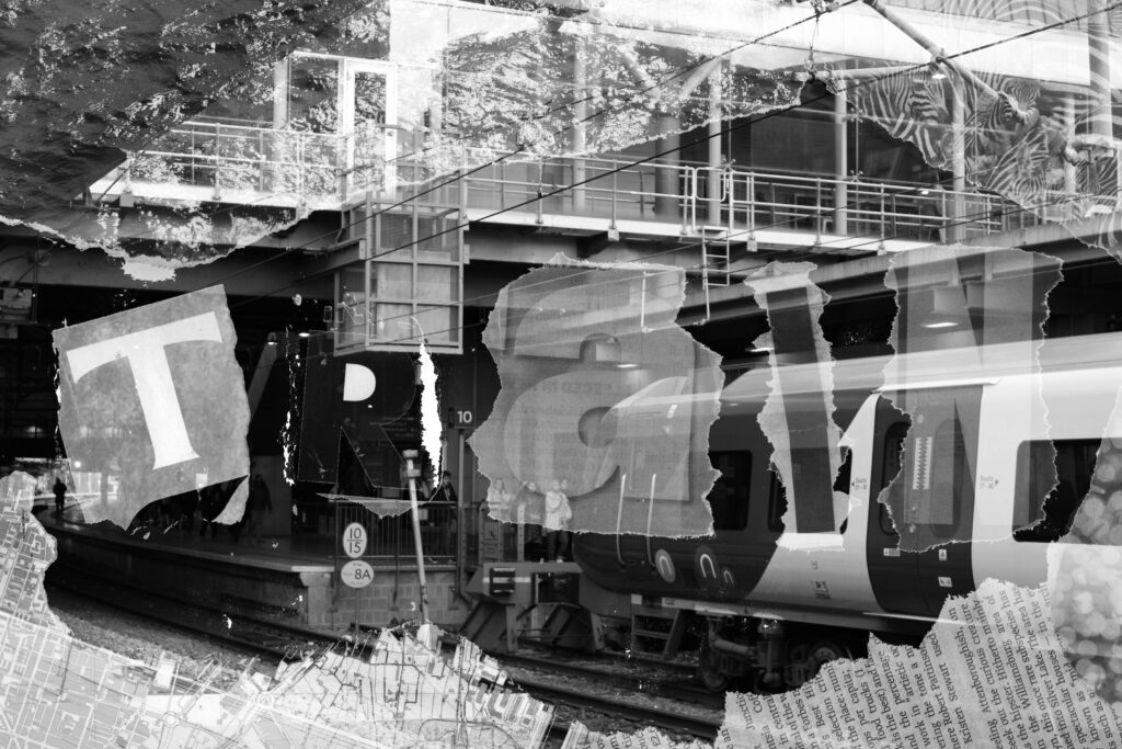 I used a piece of A4 paper and ripped out letters and patterns from different newspapers, magazines and leaflets to create a collage that links to the theme of one of my photoshoots. I chose to spell out the word ‘train’ so I could scan it and overlay the collage over a picture from my public transport shoot.