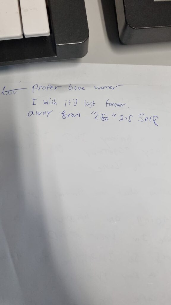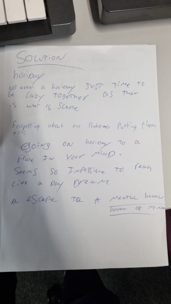 After spending some time on the melody we wanted to find out an overall theme and motive for the lyrics as this would make it a lot easier to write good lyrics. The notes show us going through ideas of holidays and places that would be relaxing for a break away from stress.