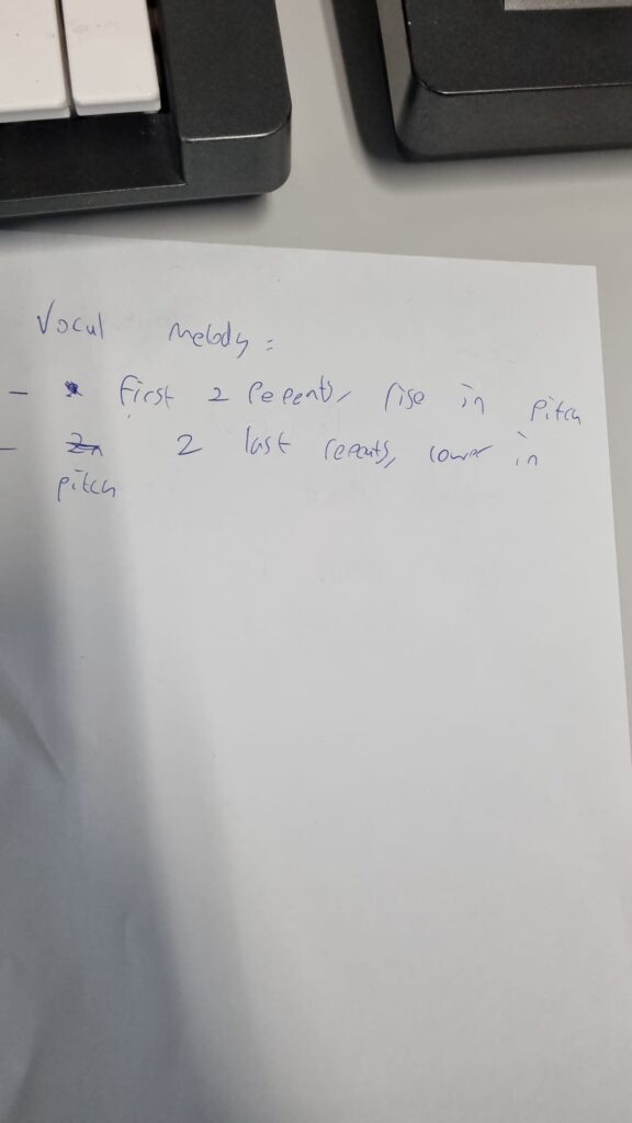 Today me and Ben used the session to find a vocal melody for the chorus as that is the main thing we need to do before chorus lyrics. We spent some time taking some videos humming and scatting different melody’s trying to get a feel on how we wanted it to go.