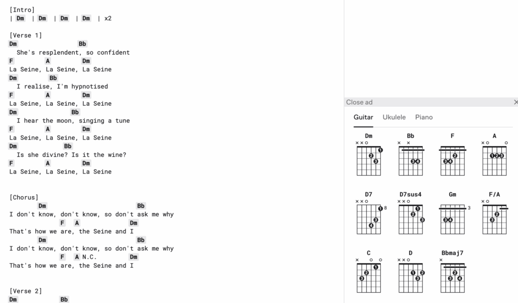 I have known how to play the majority of this song for a few months as it is a song I really like. The fast rhythm with the strumming pattern and a really simple but nice lot of chords really that really give a nice french kind of feel (Even with English words.)The chords are not too tricky and the verse and chorus is pretty much the same the only thing I struggle with in this song is the bridge of the song I have just learned today which is really quick chords one after the other. I look forward to seeing how rehearsals go. Im also learning some other ways to play the verses as it can feel pretty repetitive from the instrumental side of the song. I wish to replace some of the verses chords with barre chords to had some range to the sound like I would normally play D minor at the bottom of the fret board but I could be playing it barring the 5th fret to play the same chord just with a few different notes.
