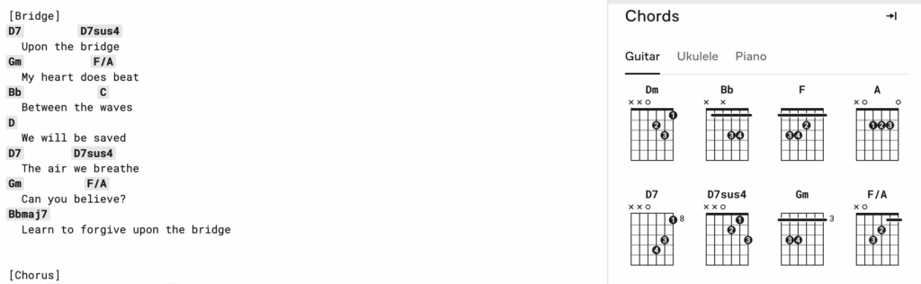 Note accuracy for me was pretty great but aside from the chords theres only the intro before the vocals and an improvised part to bring us back to the chorus after the bridge and I just missed one note for that part. Thinking of the notes in the chords the was two times where I tried to turn the normal D Minor and B into like D Minor 7 and same idea for the B and it resulted in my net getting all the notes of the chords to ring out which isn’t great I was successful on one of the attempts and it was a nice to touch and it took the repetitive feel out again.