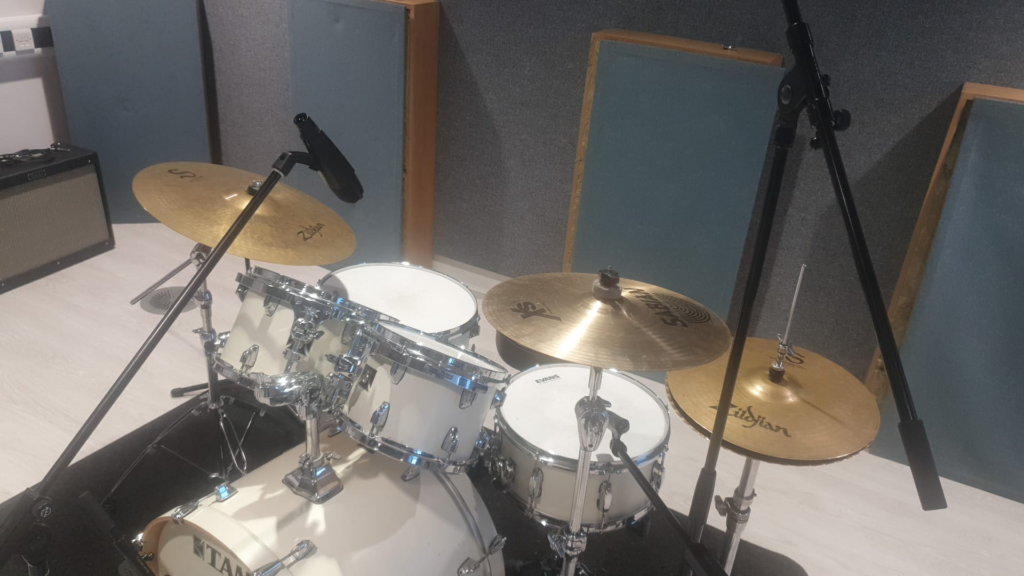 • A microphone for the snare, directed in the centre of the snare skin, this is to ensure we’re not having much bleeding from the other instruments, but also to create a fuller sound of the snare.