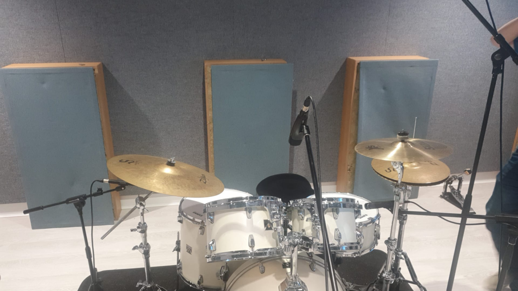 • Two overheads, one placed above the crash and hi-hat, directed at the closest half of the drum kit (snare, hi-hat, crash, toms), and the second overhead is positioned below and to the left of the ride, directed to the second half of the drums, the ride, the floor tom, etc.. – it’s good to note that we measured between the two overheads so we don’t have phasing problems when listening back to the recordings.