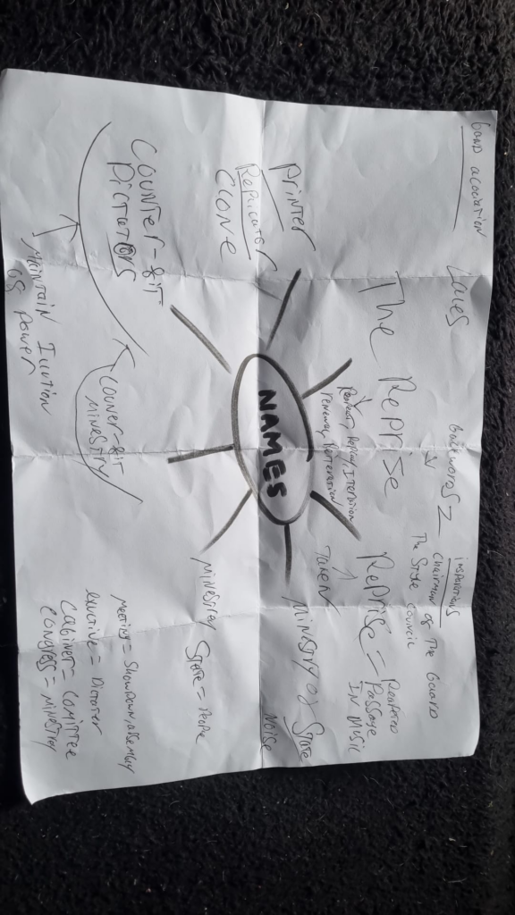 Pauls session had its ups and downs. We started out with a empty sheet of paper and just got to work with finding and writing names that we like that are taken but the other lads weren’t really giving too much ideas and opinions today so I suggested a few names I like and we worked from the feel of those names. Chairmen of the Board, The Style Council, Jamiroquai and some others. I figured I liked most of those names because they talk of power titles like Council, Chairmen and things like that so we started coming up with different words with the same meaning and got ministry, committee and more. The session went on a lot longer than we expected having struggled with agreeing on a name we lost our rehearsal time because of it. This means we failed both goals which was getting a name and finishing the doctor song. The only thing I can say is that we are closer than ever to finding a name and once I got home a found a potential melody for the chorus.