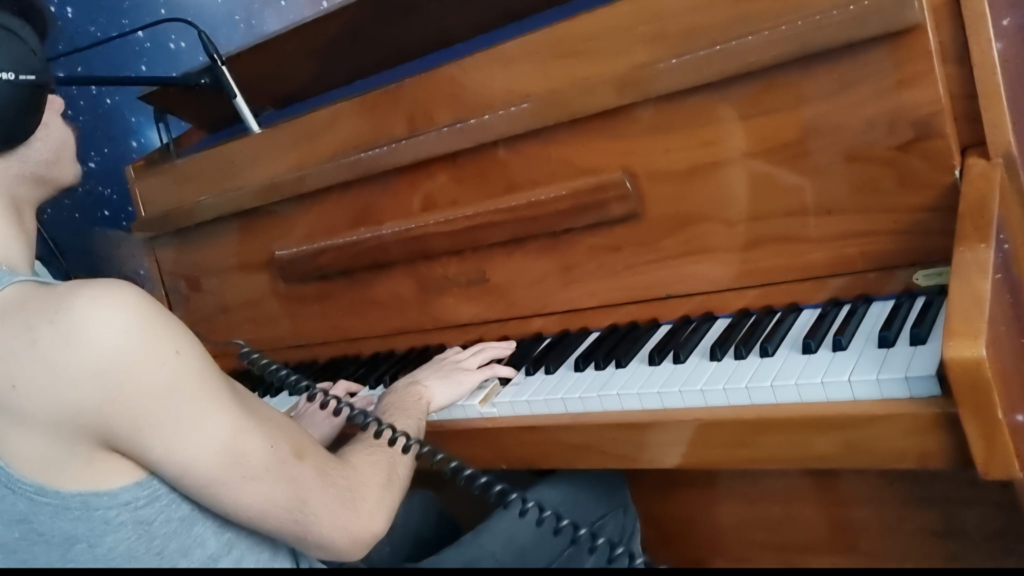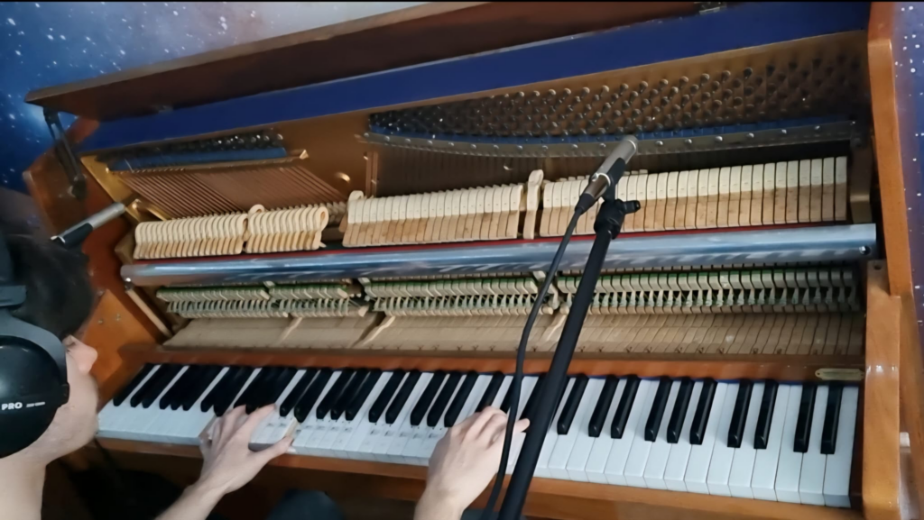 Now when it came to bens he had looked up some mic placements for an upright piano and has found one he liked the look of. He recorded his take what looked to be effortlessly and then when we went to get listen to his work we could all agree we could find a better mic placement as we could here the tapping of the keys and some other unwanted noise too. So I suggested sticking em in the top of the piano and closing the front string cover to capture the sound in the piano instead of an outside distance sound. We moved the mics and gave it another go and it sounded beautiful also we could no longer hear the unwanted sounds and was satisfied with his take.
